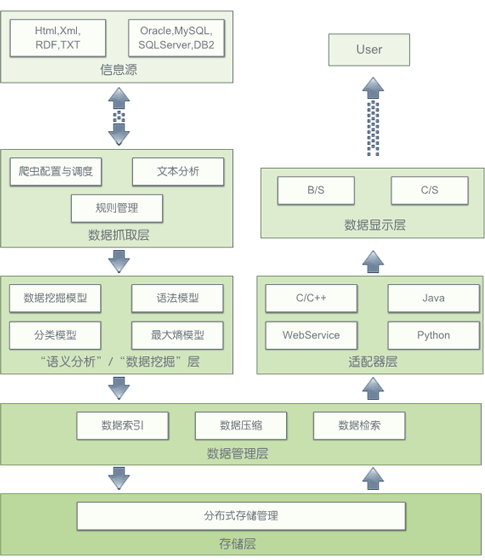 - 快速高效的非结构化数据分析与抓取,保证了向整个互联网探索的能力。