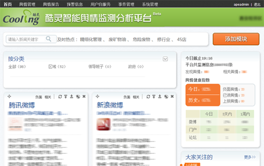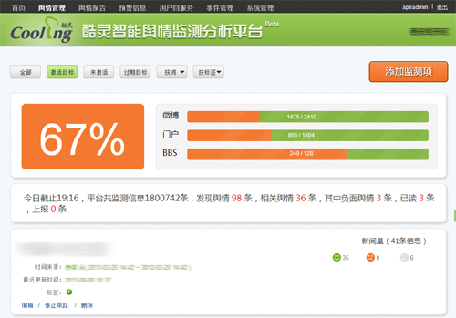 酷灵智能舆情监测与处理平台,是一个能够提供对互联网中涌现的各类舆情进行智能监测,同时对监测到的数据进行细化分析的工具。不同于市面上其它厂商提供的舆情监测软件或解决方案,酷灵舆情是一个基于云的服务,所有的舆情信息,分析结果都保存在云端。用户无需部署任何硬件环境,即可通过浏览器访问到其所关心的信息。