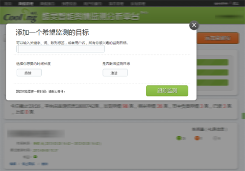 在舆情管理中,用户可以添加监测目标,同时还可以选择该监测项的监测时间和监测目标的激活状态。